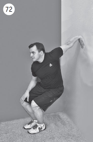 Фаза растяжения: встаете спиной к стене, отступаете от нее на один шаг. Ладонь больной руки помещаете на стену на уровне пояса, пальцы направлены вниз. Приседаете вниз, полностью выпрямляя руку в локтевом суставе. Вы ощущаете растяжение мышцы в области локтя. Удерживаете растяжение в течение 10–20 секунд. Повторить 1–3 раза. Выполнить упражнение для противоположной руки.