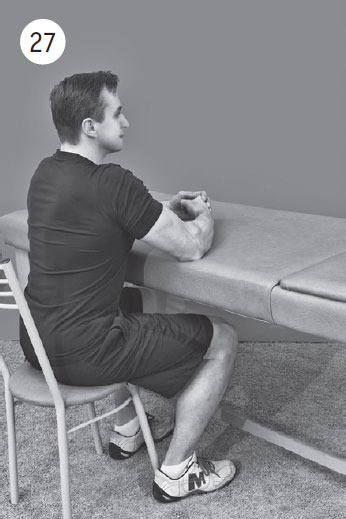 Исходное положение – сидя за столом, обе руки согнуты в локтевых суставах под прямым углом, помещаются предплечьями на стол и упираются локтями в стол, подобно шарниру. Правая кисть сжата в кулак, левая обхватывает ее снаружи.