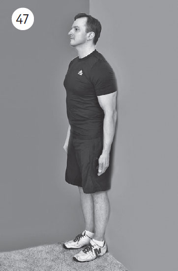 Фаза изометрического напряжения: тылом кисти давите на стену, не отрывая локтя от стены. Удерживаете состояние изометрического напряжения 20–30 секунд.
