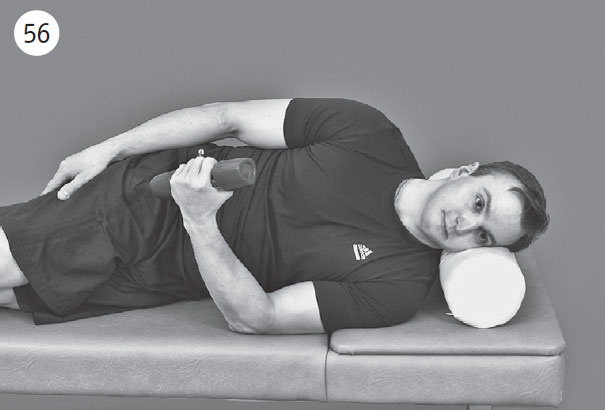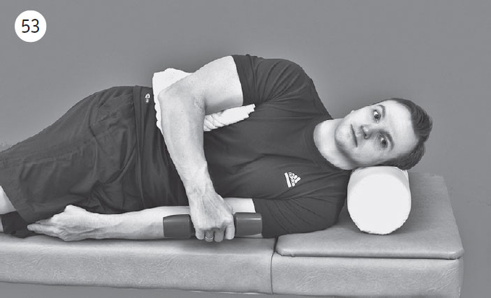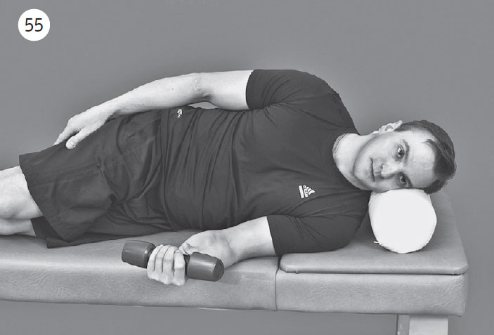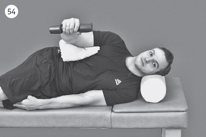 Исходное положение – лежа на здоровом боку. Под голову и под больное плечо подложены небольшие валики. Больное плечо согнуто в локтевом суставе под прямым углом. В руке небольшая гантель весом 1–3 кг.