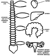 Поражение в области V-IX грудных позвонков вызывают боли, схожие с болями при заболевании желудка, VIII-IX грудных позвонков - боли, похожие на боли при заболеваниях двенадцатиперстной кишки и т.д.