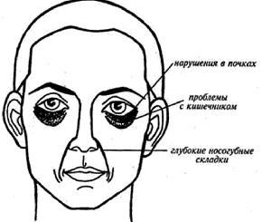 Почки. Внешним проявлением болезни почек часто является снижение слуха. Почечный больной часто страдает от подсознательного чувства страха. Глаза при патологии в почках впалые, как бы "стеклянные". Нередко глаза беспокойно бегают из-за какого-то страха. При нарушении функции почек появляется припухлость нижних век, "мешки" под глазами (непосредственно под нижними веками).