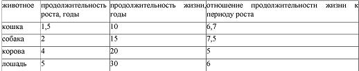 Эта зависимость подтверждается расчётами многих учёных-биологов. Проверим эту закономерность на примере нескольких видов домашних животных. Составим таблицу:Отношение продолжительности жизни к периоду роста животного и даёт нам коэффициент от 5 до 7.