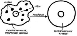 Зашлакованная клетка становится, как запотевшее стекло (в котором плохо видно отражение). Голодание очищает клетку, как бы ’’протирает” зеркало. И зеркало начинает блестеть - клетка молодеет, восстанавливается ее нормальная биологическая активность.
