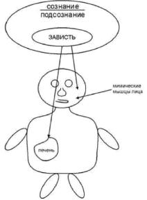 Покажем на рисунке, как отрицательная эмоция (зависть) одновременно действует и на мимические мышцы лица (стойкий спазм), и на тело (спазм желчных путей в печени, желчекаменная болезнь).