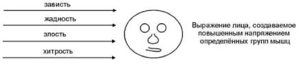 – определённые отрицательные эмоции, вытесненные из сознания в подсознание. Если человека попросить представить себе лицо злодея, лицо завистника, лицо хитрого человека, то в уме представляется какое-то определённое, характерное выражение лица (образ). Каждая отрицательная эмоция вызывает повышение тонуса определённых мимических мышц лица. Так появляется лицо храбреца, завистника, злодея. Одновременно эта же отрицательная эмоция вызывает спазм мышц и сосудов в определённом участке тела или внутреннем органе.
