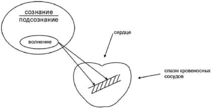 Отрицательные эмоции (волнения, переживания, стресс), вытесненные из сознания в подсознание, приводят к стойкому спазму (сужению) сосудов, кровоснабжающих сердце. А раз наступает спазм сосудов (коронароспазм), то ухудшается кровообращение и питание сердечной мышцы. Появляются боли в сердце ("крик голодного сердца") и может быть даже инфаркт (омертвение части сердечной мышцы).