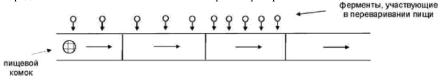 При продвижении пищевой смеси по пищеварительному тракту происходит последовательное действие различных ферментов на отдельные части пищевого комка. Можно условно представить себе биохимический конвейер по перевариванию пищи: