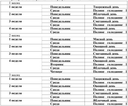Сметанный день: 300 г сметаны на весь день. Днем 1 стакан чая или кофе без сахара, можно с молоком, по 1 стакану настоя шиповника утром и вечером. Предпочтение отдается фруктово-овощным разгрузкам перед белковыми днями. При применении разгрузочных дней потеря веса составляет 0,5 - 1,5 кг. Еженедельно после разгрузочных дней проводится однодневное голодание. В это время можно пить только воду или щелочную минеральную воду 0,5-1л. В 3-хмесячной программе указаны только разгрузочные или дни голодания. Все остальные дни недели являются днями обычного питания.