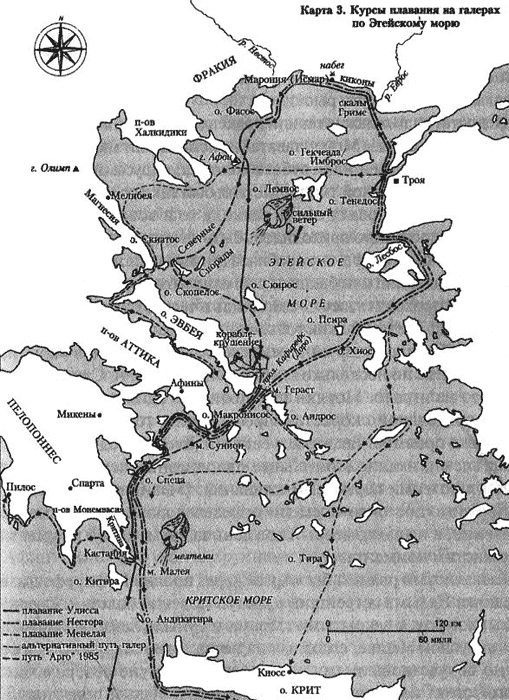 Шторм, обрушившийся в Эгейском море на Улисса, через два дня утих: «Третий нам день привела светлозарнокудрявая Эос; мачты устроив и снова подняв паруса, на суда мы сели; они понеслись, повинуясь кормилу и ветру». Маленькая флотилия вновь продолжает путь не на веслах, а под парусами; и выбранный командами маршрут, несомненно, тот же, каким по сей день следуют направляющиеся к югу парусные суда.