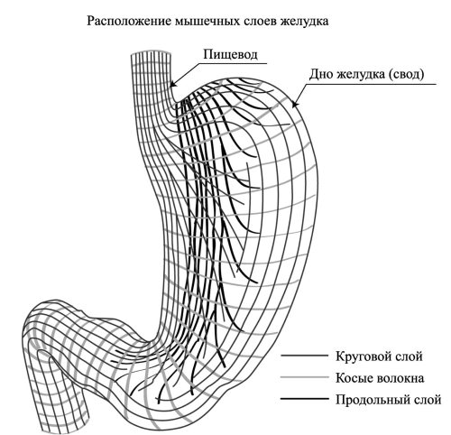 Рис. 3. Складки и эластичные мышечные волокна различной направленности желудочной стенки позволяют желудку растягиваться во всех направлениях