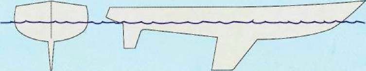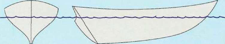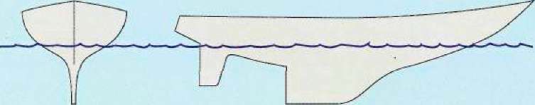 Форма киля и тип корпуса варьируются в зависимости от назначения судна. V некоторых крейсеров широкий корпус с минным глубоким килем (вверху) для надежной остойчивости, а гоночные яхты (внизу) имеют узкий корпус, позволяющий скользить по воде