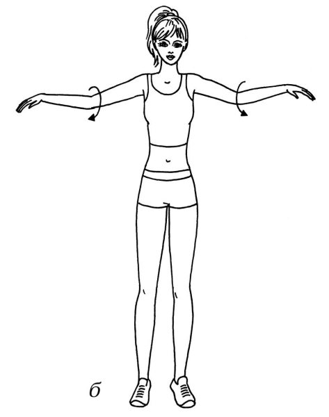 Исходное положение то же (рис. 2 а). Руки поднять в стороны, сделать круговые движения кистями вперед и назад (рис. 2 б). Выполнить упражнение по 4 раза вперед и назад.