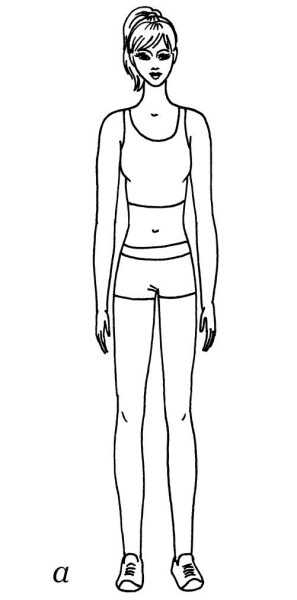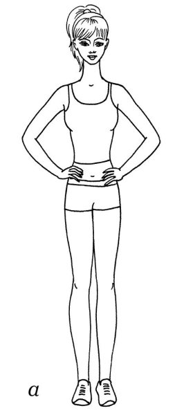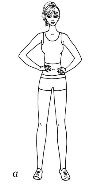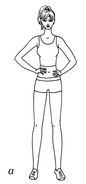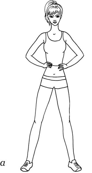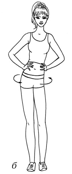Исходное положение – встать прямо, ноги вместе, руки на поясе, мышцы расслаблены, дыхание ровное и глубокое (рис. 6 а). Выполнить вращательные движения бедрами поочередно по 8 раз вправо и влево (рис. 6 б). Встать прямо, опустить руки, вдохнуть, подняв руки вверх, на выдохе опустить.