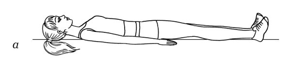 Исходное положение – лечь на спину, руки опустить вдоль туловища (рис. 5 а). Ноги поднять и завести за голову, коснуться носками пола (рис. 5 б). Принять исходное положение.