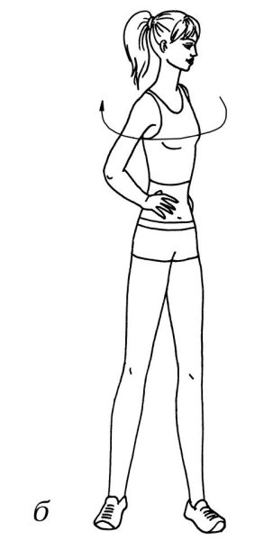 Исходное положение – встать прямо, ноги на ширине плеч, руки на поясе (рис. 7 а). Выполнить круговые движения верхней частью туловища по 8 раз вправо и влево (рис. 7 б).
