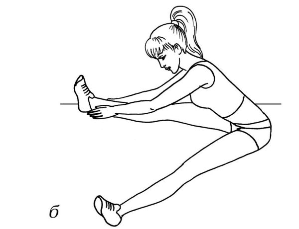 Исходное положение – сесть на пол, спина прямая, широко развести ноги в стороны (рис. 9 а). Сделать по 4 наклона то к левой, то к правой ноге, стараясь коснуться грудью коленей. Повторить упражнение 4 раза (рис. 9 б).