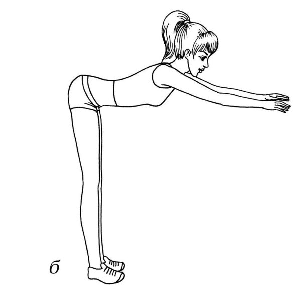 Исходное положение – встать прямо, ноги на ширине плеч, руки на поясе (рис. 10 а). Наклонить корпус вперед параллельно полу, вытягивая руки перед собой и прогибая спину в области поясницы (рис. 10 б). Повторить упражнение 8 раз.