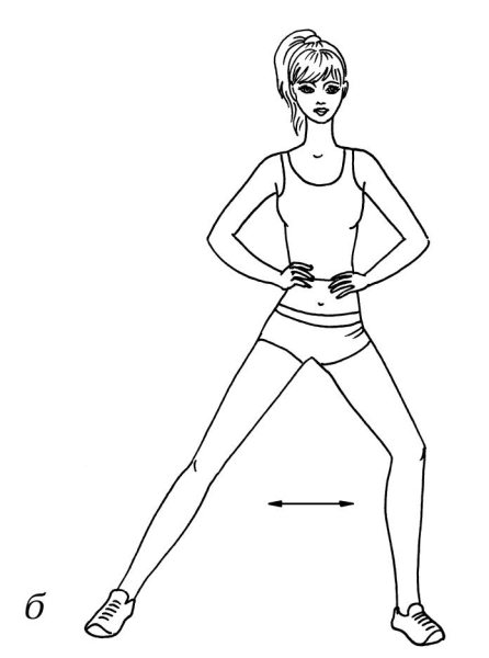 Исходное положение – встать, широко расставив ноги, руки на поясе (рис. 12а). Присесть на правую ногу, левую выставить вбок. Сделать легкий перекат с правой ноги на левую (рис. 12 6), чтобы правая нога оказалась вытянутой вправо, а на левую присесть. Повторить упражнение несколько раз.