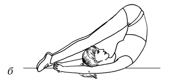 Лечь на спину, тело должно быть расслаблено (рис. 33 а). Поднять прямые ноги и завести их за голову так, чтобы пальцы ног коснулись пола. Руки положить на пол вдоль туловища ладонями вниз или завести за голову, сцепив пальцы и не сгибая локти (рис. 33 б).