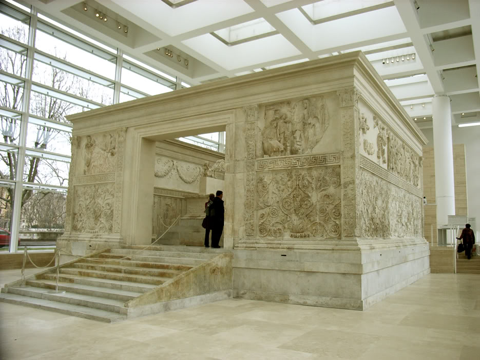 Когда строительство на Палатине было закончено, Август воздвиг в северной части Марсова Поля другое величественное здание, кроме всего прочего имевшее и политическое значение. После длительной пропаганды, дискредитировавшей Антония и Клеопару, как представителей восточных традиций и норм, постройка монументального мавзолея стала символом тесной связи дома Юлиев с самим Римом. Давно разграбленный, разрушенный монумент, имеющий когда-то на нескольких этажах склепы для Августа, его семьи, а также для Марцелла и Агриппы, и в котором хоронили всех римских принцепсов вплоть до Нервы, производит глубочайшее впечатление, такое же, как и раньше производил на современников. Позже у его входа и на опорах высекли «Деяния Божественного Августа», фундаментальное повествование о достижениях первого принцепса. Могильный холм высотой около 45 метром и диаметром в 87 метров превосходит по размерам все надгробные памятники римских аристократов. Глубокая символика, заложенная в нем, стала очевидной совсем недавно, когда была обнаружена долго не обращавшая на себя внимание связь мавзолея с двумя другими замечательными сооружениями той эпохи — с алтарем и солярием Августа.