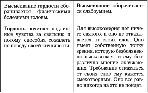 Становясь умнее за счет рассудительности и богаче за счет собственного достоинства, человек утрачивает часть рассудительности и достоинства, и у него ухудшается самочувствие. Обратите внимание на слово «самочувствие». Плохое самочувствие означает плохое чувствование, то есть знание себя, а значит, незнание своей основной сущности. Так гордость принимается то сетовать на высокую стоимость косметики, образования и богатого стиля жизни, то похваляется тем, сколько всего пришлось пережить, посещая косметические салоны, получая образование и отказывая себе в человеческих потребностях в процессе сколачивания состояния. Так незаметно гордость перерастает в высокомерие.