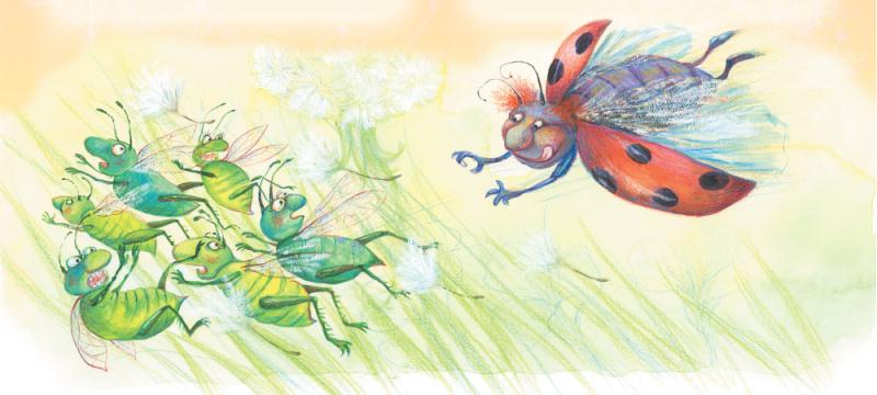 Последней взмыла в небо божья коровка. Она описала в воздухе круг, затем врезалась в самую гущу зелёного облака. Побыла внутри немного и вырвалась вперёд, увлекая всё стадо за собой. Так постепенно и растаяли они в небе, словно перелётные птицы.