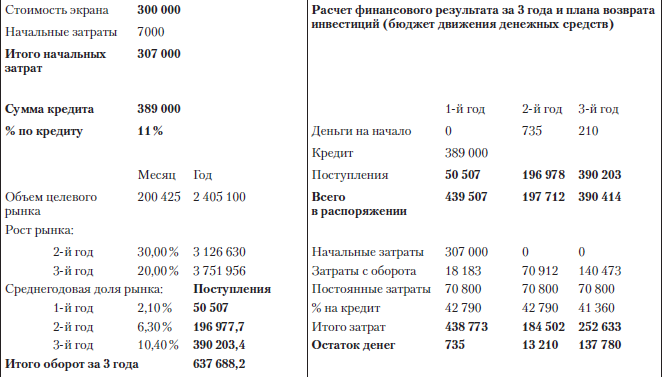 1. Возврат инвестиций обеспечивается за три года в том случае, если объем целевого рынка рекламы (наружки) составляет $410 000 месяц, что превышает объемы рекламного рынка нашего региона в 4,8 раза. Это объясняет, почему данный бизнес рентабелен в Москве, Питере и некоторых других экономически развитых регионах. Можно сделать вывод, что установка экранов во многих городах имеет смысл только в рамках долгосрочных инвестиционных проектов, предполагающих построение сети экранов по всей России. Разумеется, возможен альтернативный вариант финансирования – из бюджета. В этом случае рентабельность проекта не имеет значения.