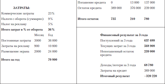 В этом случае через три года непогашенный остаток кредита составит $131 000, суммарные потери – $130 064. Вывод: даже при идеальных условиях ведения бизнеса обеспечить возврат инвестиций в течение трех лет невозможно.Расчет бизнес-плана по светодиодному экрану: вариант MIN (все расчеты приводятся в USD)