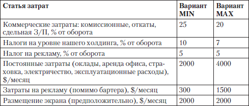Теперь оценим ожидаемые темпы роста рынка. По оценке вице-президента корпорации DEF – крупнейшей Компании нашего региона, работающей в данной сфере, – быстрый рост рынка рекламы (30 % за год), вызванный его предыдущей неразвитостью, будет продолжаться еще год. После этого рынок стабилизируется. Можно ожидать, что в дальнейшем его рост не превысит 20 % в год.Начальные затраты, включая стоимость светодиодного экрана Мы определяем стоимость светодиодного экрана равной $300,000. Это один из переменных параметров, влияние которого на рентабельность бизнеса мы впоследствии будем анализировать. Кроме того, необходимы начальные затраты на организацию офиса: ремонт, отделка, обстановка, оборудование, коммуникации, вывеска и т. д. В варианте MIN эти затраты составят $4000, в варианте МАХ – $10 000.