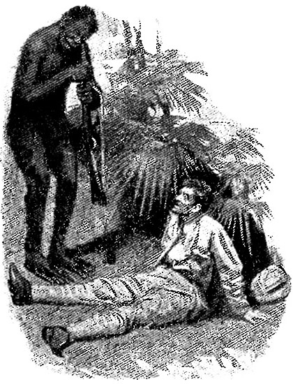 Проснувшись от яркого солнечного света, я увидел над собой — как показалось с первого взгляда — огромного орангутанга; он стоял в двух шагах от меня на задних лапах, рассматривая со всех сторон мое ружье, которое держал в руках. Я живо вскочил, но он схватил меня за шиворот, прежде чем я успел выпрямиться. Его рука впилась в мое тело, как клещи паровой машины. Ясно было, что вырываться — глупо; он меня поймал, и мне оставалось покорно ждать, что из этого выйдет.