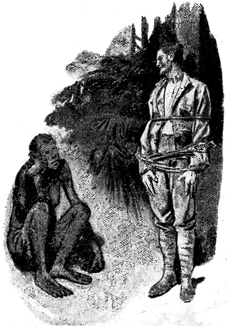 Как я уже сказал, пришлось покориться неожиданной неволе в руках Недостающего Звена. Около получаса вел он меня вперед по тропинке, потом свернул в сторону, где кусты были пожиже, и мы очутились на маленькой полянке: тут стоял шалаш из воткнутых в землю молодых деревьев, связанных наверху лианами. Мы остановились, и господин Звено выкрикнул что-то на своем наречии; в ответ на это из шалаша появилось другое существо — по всей видимости, его супруга. Оба затараторили что-то, рассматривая меня и ружье, и, очевидно, решили, что находка интересная. «Господин Звено» подвел меня наконец к дереву, привязал лианами, а сам ушел, прихватив с собой дубину.
