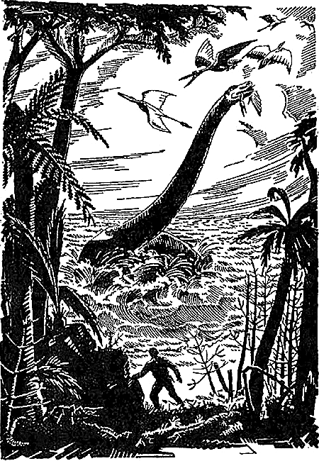 Этого я знал по учебнику геологии. Оно принадлежало к сухопутным ящерам и шло, ломая на пути деревья гигантской тушей и волоча за собою длинный хвост. Маленькая сравнительно голова и тонкая шея совершенно не соответствовали грузному туловищу. Чудовище срывало побеги с деревьев побеги и пожирало их. Оно мирно паслось, как пасутся наши коровы.