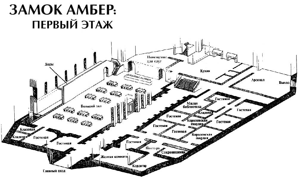 Сразу за входом в замок расположены две двери. Первая ведет в Желтую комнату, называемую так из-за желтого цвета каменной облицовки. Камень настолько схож с амберским золотом, что тут чуть было не поместили главный трон. Однако и без трона король устраивает в Желтой комнате большие аудиенции и ведет официальные переговоры. Впрочем, как мы увидим дальше, по-настоящему он работает в своих покоях.