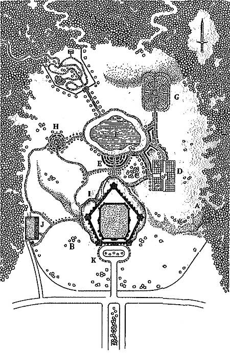 За дорожками вы видите маленькое искусственное озеро (F). Дальше Бенедикт затеял еще японский сад (G). По левую руку — обычный сад, похожий на английские сады восемнадцатого века в вашей Тени (Н). На мой взгляд, он немного слишком строгий и чопорный, но, по крайней мере, здесь есть кусты и живые изгороди.