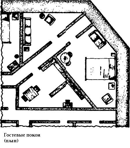 Комната отражает его своеобразные вкусы. Огромный, почти на всю гостиную, пестрый восточный ковер воспроизводит сцену лесной охоты, ряд деревьев главенствует над всей комнатой. Считаясь с этим, Мерлин поставил здесь только простой диван и два кресла.