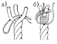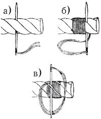 Закрепляется змейка полушлагом: иглу разворачивают под первым стежком в сторону второго (рис. 25, в). Петлю из нитки делают под иглой и полученный таким образом полушлаг хорошо закрепляют в бороздках между прядями. Длина марки должна быть немного меньше диаметра троса.
