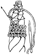 Фигурную оплетку завершают следующим образом: у самого конца троса, там где остается мало места, пропускают некоторые штыки так, что их количество в каждом ряду последовательно уменьшается. Закрепляют конец оплетки так же, как при наложении заплат на паруса (см. рис. 150). Конец нитки закрепляют двумя штыками и с помощью иглы проводят внутрь троса.