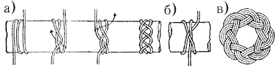 Вертикальная оплетка (рис. 88). Выполняется аналогично приведенным выше способам из нескольких тонких каболок, пенькового шнура вокруг более толстого сердечника. Начало плетения такое же, как при оплетке вкруговую (см. рис. 86, а), а именно, середину нитей прикрепляют небольшой маркой и каболки перегибают на одну сторону. Нить, на которой наложена марка не обрезают, а сохраняют длинные концы, которые включают в оплетку и проводят по спирали вокруг оплетаемого сердечника. Выполнение оплетки осуществляется следующим образом: ходовую каболку в порядке очереди укладывают полушлагами вокруг длинной нити – основы, идущей по спирали. При этом лучше, если концы каболок, образующих полушлаги, будут направлены в сторону уже вплетенных каболок, но можно направить их в направлении плетения, при этом рисунок оплетки будет несколько иным. На рисунке показана оплетка с полушлагами, направленными в сторону, противоположную плетению.