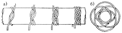 Плетение пятишлажного валькнопа легче всего разъяснить, если он изображен выполненным на предмете цилиндрической формы (рис. 92, а). Весь кноп изображен на передней стороне стеньги, на обратной стороне стеньги образуются прямые параллельные линии.
