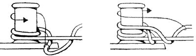 Если необходимо закрепить свободный конец на одиночном пале, причальной тумбе (пушке), лучше всего это делать, как показано на рис. 94. Свободный конец дважды обносят вокруг пала, сгибают под коренной частью троса, обносят вокруг пала в обратном направлении и еще один раз в направлении первых двух шлагов. Такое крепление никогда не затягивается. Этот способ применяют также для временного крепления оттяжек на ноке лебедки. Для крепления стального троса сначала делают более двух шлагов вокруг пала, чтобы он не разошелся.