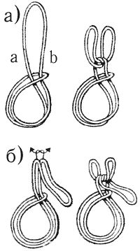 Доску или люльку (беседку) закрепляют люлечным узлом: одна часть троса оказывается над доской, а две другие – под доской (рис. 98, а). Узел завязывают так, что верхняя часть стропа проходит посередине в петлю. На судах с клинкерной обшивкой корпуса петлю прибивают к нижней стороне люльки, потому что в противном случае она сползет с люльки, если зацепится за стык поясов обшивки, и люлька упадет. Для повышения устойчивости люльки рекомендуется петлю прибивать во всех случаях.