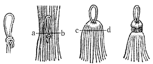 Прекрасные небольшие швабры изготовляют из отрезка хлопкового троса или куска старой парусины. Петлю делают из подходящего материала: для больших швабр – из тонкого линя, для небольших – из сезня, сплетенного из пяти хлопковых каболок или рыболовной лесы. Концы петли связывают полупрямым узлом и петлю вводят в середину плотнособранных каболок так, чтобы они; были ровно распределены вокруг петли, и затем все вместе прочно скрепляют по линии а – b (рис. 101). Затем часть каболок перекидывают на другую сторону, распределяют равномерно и освобождают петлю посередине согнутых каболок. Петлю свободно вытаскивают из каболок и снова каболки равномерно распределяют под петлей, затем по линии с – d накладывают бензель близко, к узлу на петле, получая таким образом круглую головку швабры. Каболки ровно подрезают снизу, чтобы швабра имела привлекательный внешний вид.