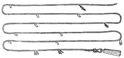 Выплетенные каболки можно обрубать сразу или после того, как огон будет готов. Первый способ более выигрышный, так как места отреза можно легко скрыть под оставшимися каболками, что делает сплесень более опрятным. После первых двух полных пробивок делают три-четыре пробивки неполными прядями, так что весь сплесень состоит из пяти-шести пробивок.
