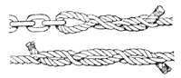 На растительных тросах "сплесень сапожника" не применяется как слишком короткий сплесень. Но все же его можно использовать, например, при сращивании тонких оттяжек для стрелы лебедки. В этом случае достаточно выполнить по две пробивки с каждой стороны. При сращивании четырехпрядных тросов пробивку выполняют под две пряди, т. е. прямо через середину троса.