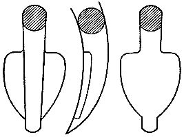 С учреждением адмиралтейского стандарта, который воплотил в себе наивыгоднейшие пропорции и формы лучших конструкций, в мировом производстве якорей отмечается определенная унификация чертежа. Якоря стали походить друг на друга как братья-близнецы. Примерно до шестидесятых годов прошлого века, пока еще новый якорь не получил распространения, по форме якоря можно было точно определить, в какой стране он изготовлен. На рис. 55 показаны три якоря, относящиеся к началу XIX века. Русские (а), французские и английские (в) якоря имели больший отгиб рогов, нежели шведские и датские (б). Как от тех, так и от других формой лап отличались якоря голландских мастеров (рис. 56). Хотя якорные мастера различных стран иногда и изменяли пропорции и форму адмиралтейского якоря по своему усмотрению, форма его лапы была признана наивыгоднейшей (рис. 57) [53].