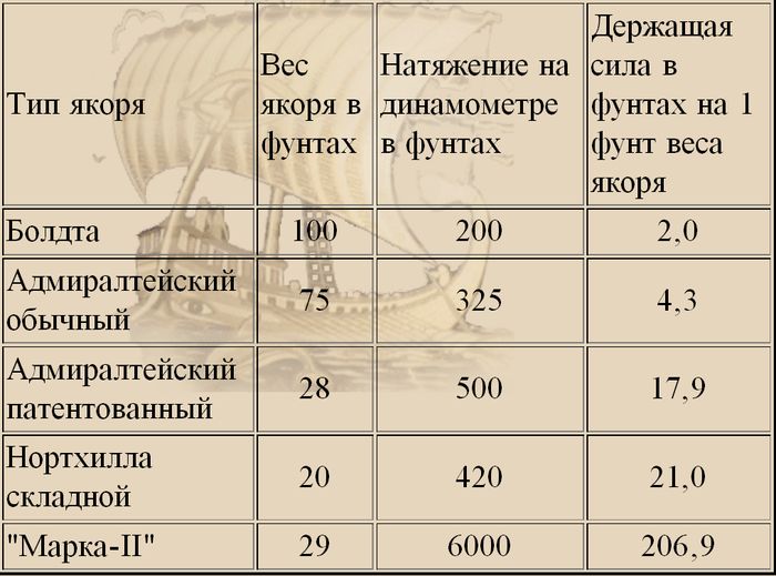 Вот так выглядела таблица испытаний пяти якорей, проведенных в 1948 году в заливе Сан-Франциско на песчаном грунте:
