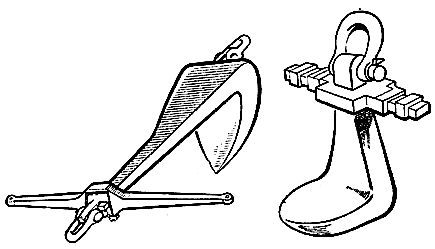 Однорогий якорь применяется не только как мертвый: им пользуются при производстве дноуглубительных работ на рейдах и на реках. Когда несамоходный земснаряд прорывает траншею, он передвигается с помощью своих лебедок и двух завезенных в разные стороны однорогих якорей, которые носят название папильонажных. Это название происходит от французского слова papillon — бабочка. Когда земснаряд, прорывая траншеи, передвигается влево и вправо, то говорят, что он работает папильонажным способом, то есть его движение похоже на полет бабочки. По мере передвижения земснаряда вперед якоря все время приходится перекладывать на новое место. Это делают с помощью самоходных судов — завозней. Иногда приходится папильонажные якоря переносить вручную: мотозавозня из-за мелководья не может их доставить на нужное место или якоря необходимо заложить на сухих песках. Поэтому к папильонажным якорям предъявляют два немаловажных требования: легкость и высокая удельная держащая сила на сыпучих грунтах. Особенно это важно, когда земснаряду приходится работать на тяжелых грунтах или при большом слое срезки. В таких случаях держащую силу однородного «инвалида» пытаются увеличить за счет увеличения площади его лапы (рис. 131).