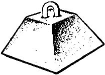 Кроме «адмиралтейских инвалидов», на мягких илистых или мелкопесчаных грунтах хорошо работают железобетонные массивы в виде четырехгранной или многогранной пирамиды (рис. 134), сегмента (рис. 135) или так называемые «лягушки» (рис. 136). Сегменты и «лягушки» держат не только за счет своего большого веса, но и за счет присасывания, которое возникает благодаря полукруглой выемке в их нижней части.