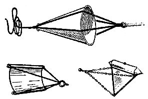 На больших судах, как правило, плавучих якорей нет. В случае необходимости их изготавливают судовыми средствами из бревен, парусины и троса (или цепей). Существует множество конструкций плавучих якорей. Наиболее распространенные из них показаны на рис. 164.
